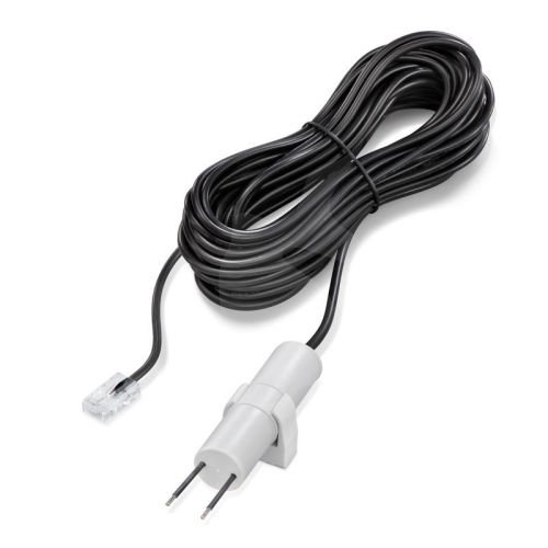 Enheden leveres med en robust vandføler med 10 meter kabel og RJ45-tilslutning. Sensorens monteringshøjde bestemmer koblingspunktet - når vandet når de to metalkontakter, lukkes kredsløbet, og relæet aktiveres.