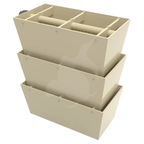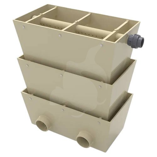 Vandet tilføres via 1xØ50mm indløb og fordeles jævnt gennem den integrerede spraybar, hvorefter det passerer gennem de biologiske kamre. Den åbne konstruktion sikrer effektiv gasudveksling og optimale betingelser for nedbrydning af ammonium og nitrit.